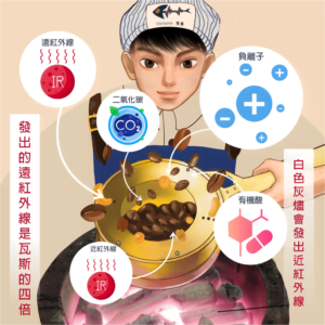 燃燒備長炭時,同時釋放出高能量的遠紅外線和近紅外線,像是天然微波爐一樣,直接加熱咖啡豆內部,特有的波長很容易和水產生共振,熱量很快的傳遞到咖啡豆深處,打破了傳統烘焙曲線的極限,達到機器無法觸及的風味。
